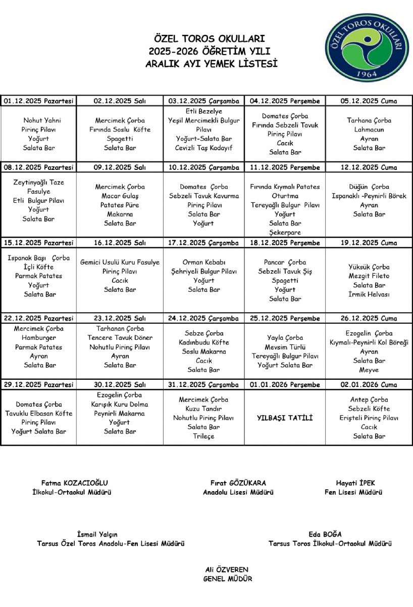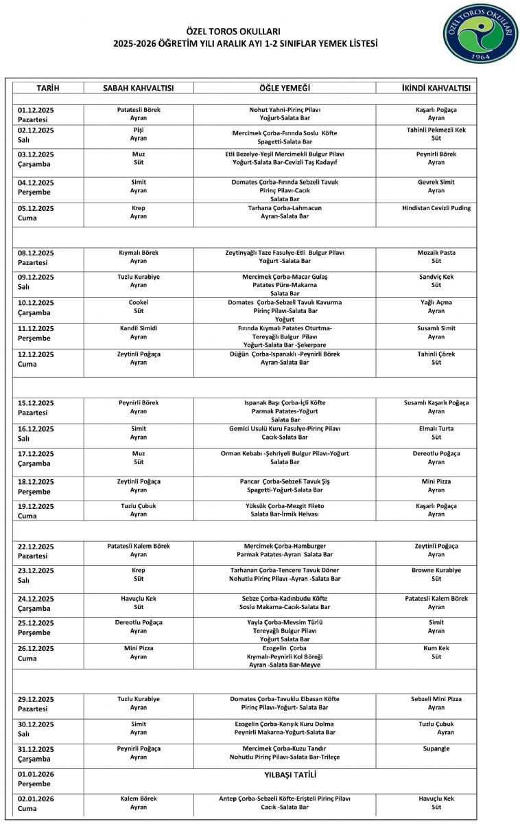 Aylık Yemek Listesi